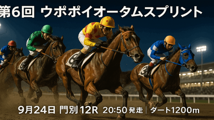 9月24日門別12Rウポポイオータムスプリント(ダ1200m)の予想。デステージョ中心に、展開・追い切り評価(S〜C)と本命・相手、馬連&3連複の買い目例まで網羅。