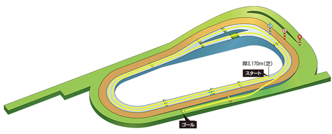 バンケット(“3段跳び”)を含む大障害コース+直線半ばの可動ハードル。障害15でリズムと飛越精度が問われる一方、距離は比較的短くスピードも必要。最終合流後は平地の持続力勝負になりやすい。