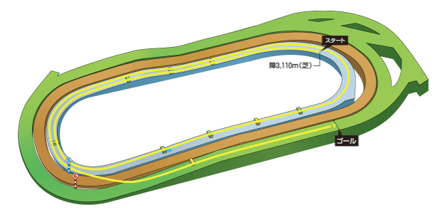 - 2コーナー発走→障害コース1周半→平地芝直線へ合流